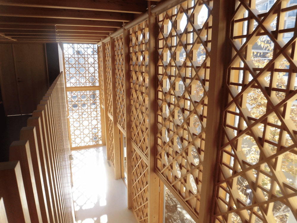 稲山:あの耐力壁の原型は、 「宿毛まちのえき 林邸」を 古谷誠章先生と取り組んだプロジェクトにあります。私たちの研究室では、光や風を通す細い格子状の部材を使った耐力壁を開発してきました。視覚的にも美しく、構造的にも機能するもので、林邸という築 130年の建物で最初に導入し、そこでは土佐組子の職人が製作を担いました。