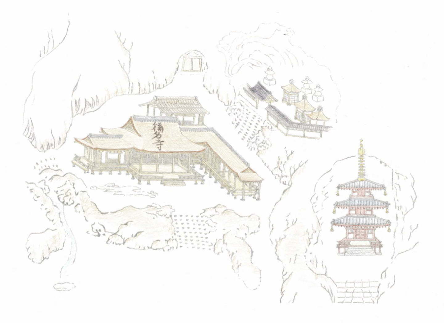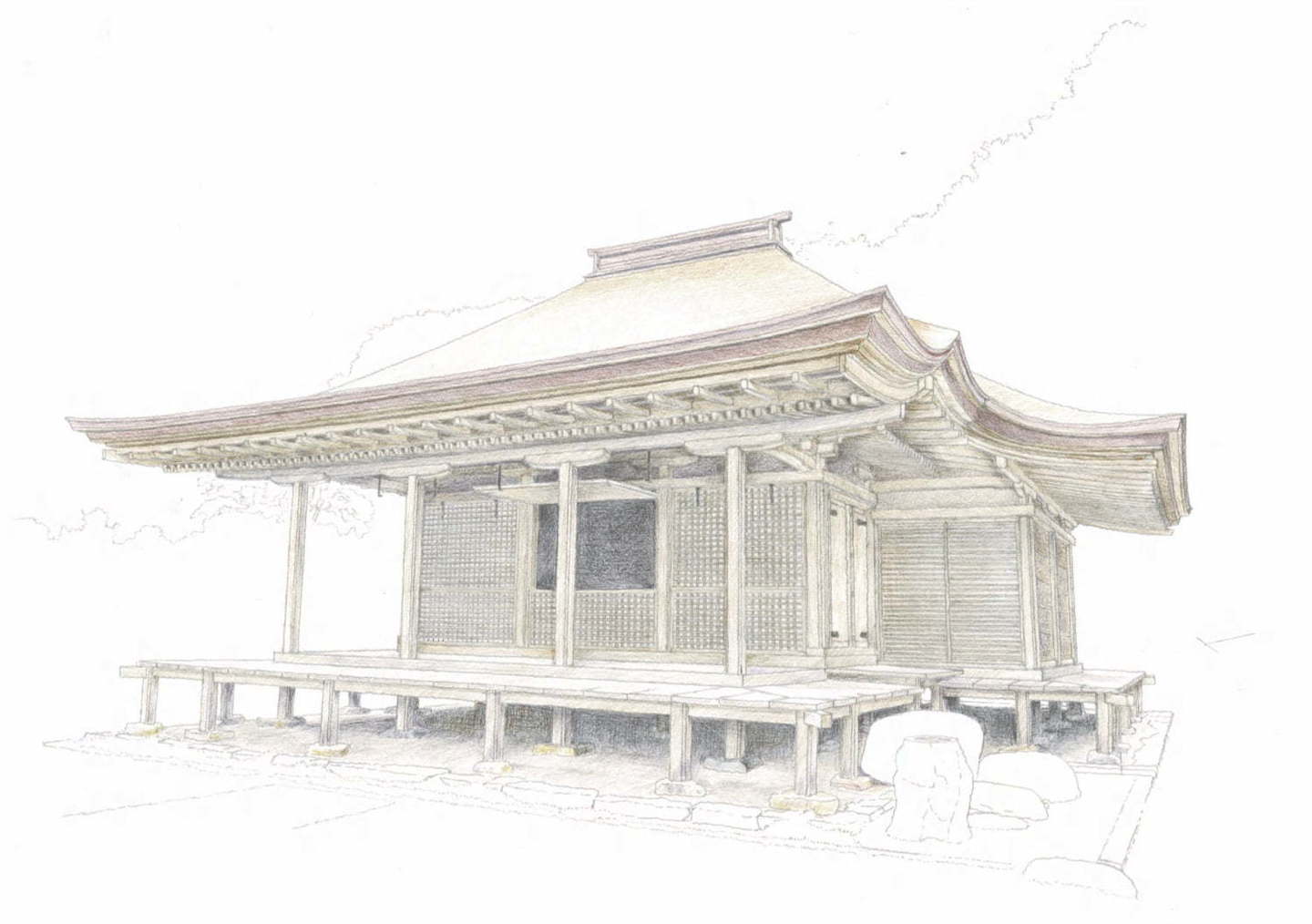 金蓮寺弥陀堂は三間四方の仏堂の正面と、側面の二面に庇が取付く規模の小さな建物ですが、仏堂の寄棟屋根に庇の片流れの屋根を縋破風によって巧みに一体化した建物です。仏堂内部は来迎柱を前に須弥壇を設け、阿弥陀三尊像が祀られており、天井は二重の折上げ小組格天井です。(作画:木岡敬雄)