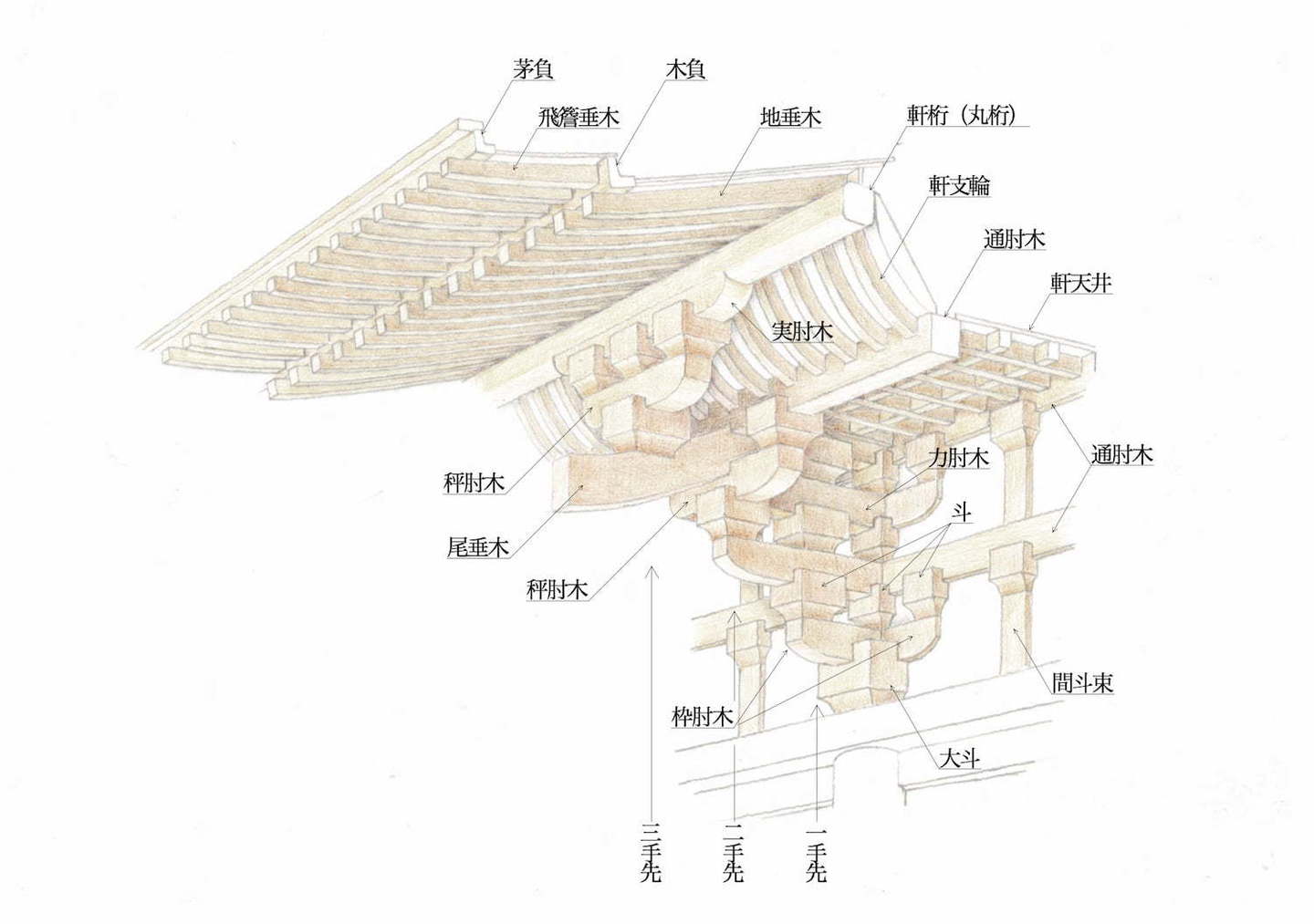 組物の代表的な造りで最上級の建物に使われる組物です。柱位置からの出を手先といいますが、3つ目の手先が軒桁の位置となる組物です。持ち出された三手先目は構造上も有利となるよう太い斜材の尾垂木を介して支持されています。(作画:木岡敬雄)