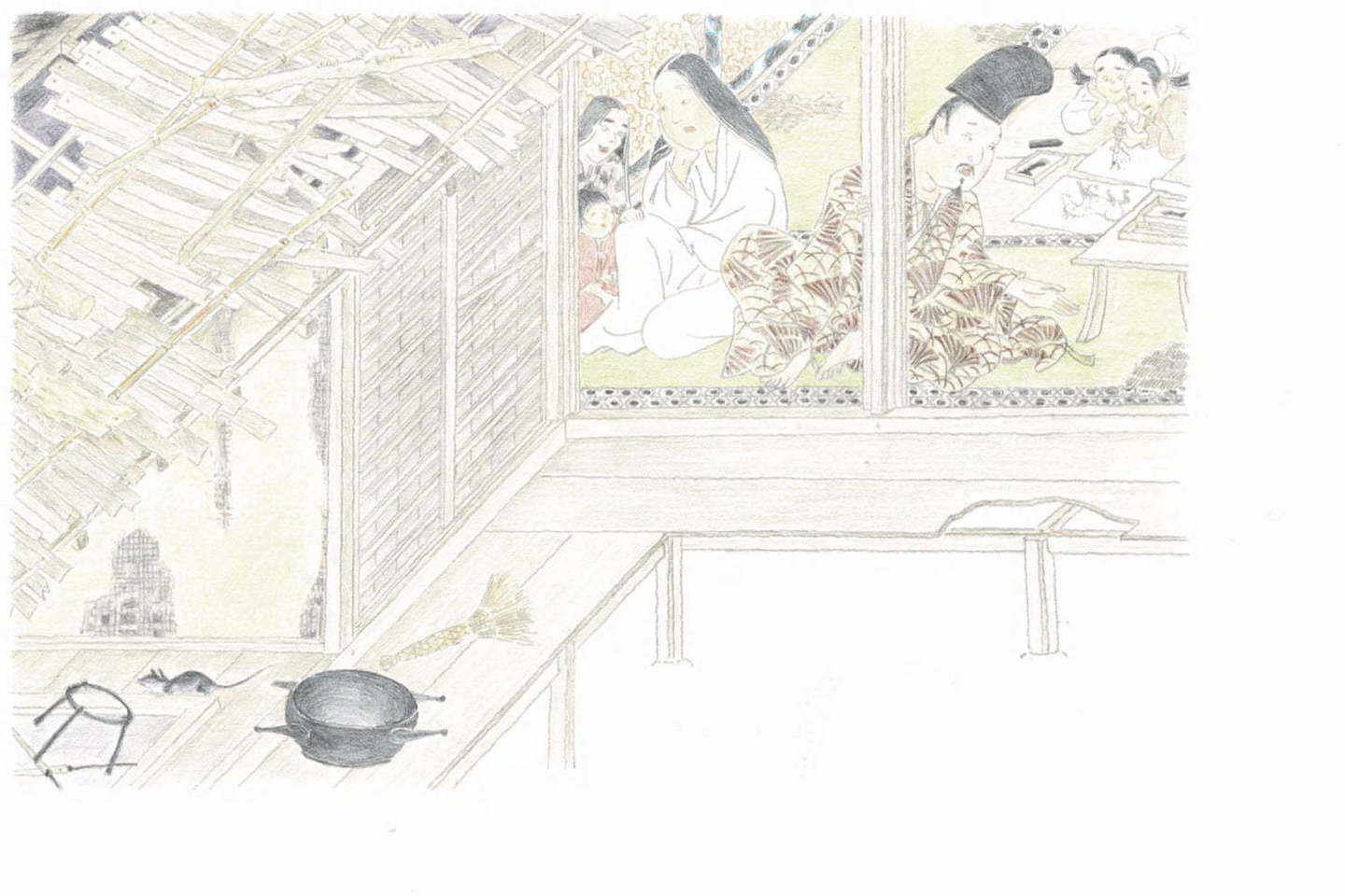 明治になって徳川家から皇室に献上された絵巻の一場面。絵巻は鎌倉時代末の作品で領地をめぐる訴状に添えられたものといわれ、絵の描写には誇張が含まれていますが、屋根の葺き板と棟木を留める釘穴まで描かれており、絵師が実際に目にした板葺き屋根を参考に描いたとみられます。絵師の家族の姿を生き生きとした描線で表現するだけでなく、建物の細部に至るまで克明に描かれており、絵師の優れた技量がうかがえます。(作画:木岡敬雄)