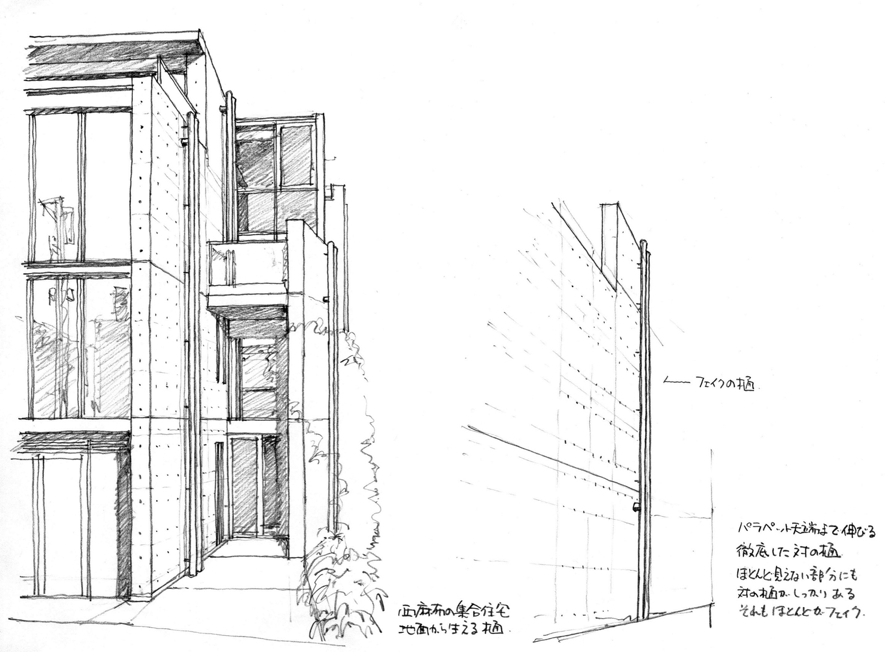 堀:僕も彼の建築をいろいろと見てきましたけど、きちんとした雨どいを 1本も見たことがないんですよ。基本的に “セーフ ”じゃない。横引きで無理に引っ張って、片方にだけ排水するような納まりになっていたりして、それがまた継ぎ手もないような処理だったりする。これは一体どうやって排水しているの?って不思議に思うことが多々あります。