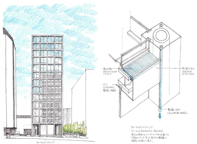 内藤:谷口さん設計の青山に建つ 「フォーラムビルディング」、には驚かされました。雨の処理が見事で、カルテジアン・グリッドを壊さずに美しく納められていました。予算があったのかもしれませんが、それ以上に「雨を見せない」という設計思想が徹底していたと思います。